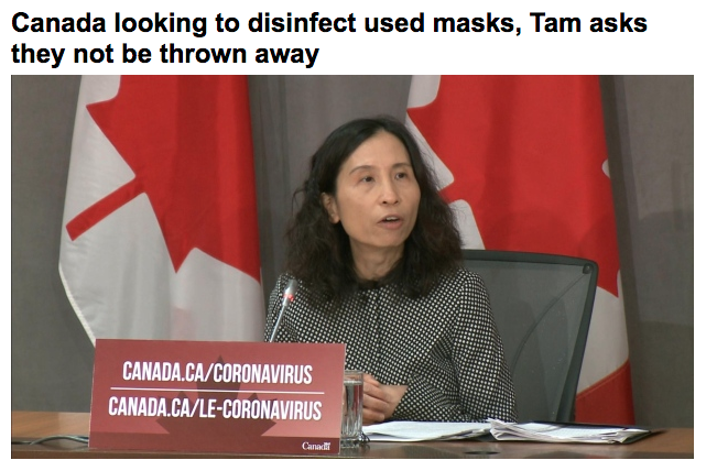 加拿大首席公共卫生官谭咏诗(Theresa Tam)发出呼吁:在口罩供应短缺的情况下,请各家医院先别扔掉用过的外科口罩及其它个人防护设备(PPE),联邦公共卫生局正在研究,这些使用过的口罩及PPE是否在消毒之后可以重新利用。